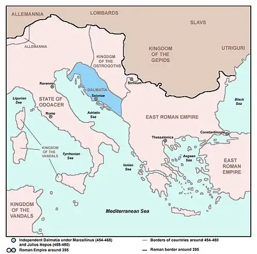 - ^ Even though Romulus Augustulus is widely considered to be the last Roman emperor in the West, Nepos still claimed the title in Dalmatia.