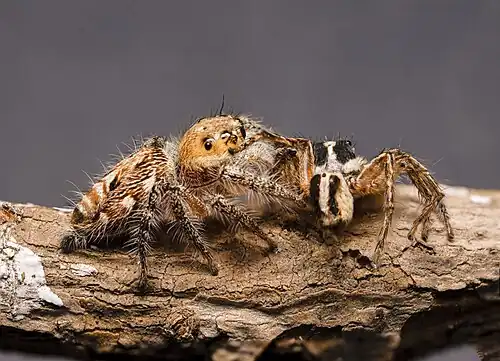 Jumping spiders conduct complex, visual courtship displays using movements and physical bodily attributes. A form of sexual dimorphism, the males possess plumose hairs, colored or iridescent hairs (particularly pronounced in the peacock spiders), front leg fringes, structures on other legs, and other, often bizarre, modifications. These characteristics are used in a courtship "dance" in which the colored or iridescent parts of the body are displayed. In addition to displaying colors, jumping spiders perform complex sliding, vibrational, or zigzag movements to attract females. Many males have auditory signals, as well. These amplified sounds presented to the females resemble buzzes or drum rolls.[39] Species vary significantly in visual and vibratory components of courtship.[40] The ability to sense UV light (see Vision section) is used by at least one species, Cosmophasis umbratica, in courtship behavior.[41][42] Cosmophasis umbratica males have markings that are only visible in UV and the females use the markings for mate choice.[43]