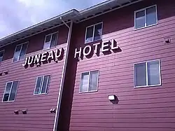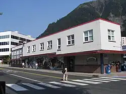 View of Juneau from the Goldbelt Tram. The Juneau–Douglas Bridge spans the Gastineau Channel. Alaska State Capitol South Franklin Street Downtown with Mount Juneau in the background National Shrine of St. Thérèse Alaska Governor's Mansion Valentine Building | |