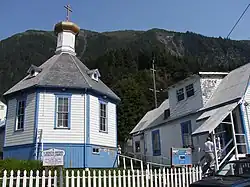 The St. Nicholas Russian Orthodox Church was completed in 1894 and has maintained an important presence among the Tlingit, Serbians, and other Europeans who follow Orthodox traditions. The iconostasis has six large panels which were sent from Russia.[17]
