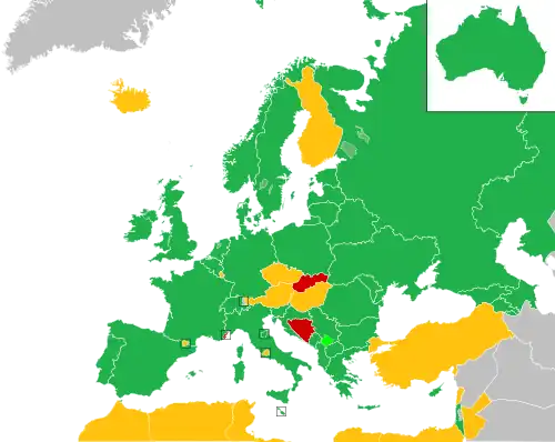 All active member broadcasters of the EBU are permitted to take part in the contest,[2] though the contest has been broadcast in several non-participating countries.[13][54] Associate member broadcasters of the EBU may be eligible to compete, dependent on approval by the contest's steering group.