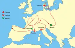 - ^ Danish: Jylland [ˈjyˌlænˀ], Jyske Halvø or Cimbriske Halvø; German: Jütland, Kimbrische Halbinsel or Jütische Halbinsel)