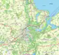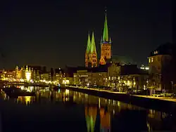 The peninsula's land border in the southeast and south is constituted by a string of several rivers and lakes: from the mouth of the Trave at Lübeck-Travemünde up to the mouth of the Wakenitz into the Trave (in Lübeck), from there up the Wakenitz until its outflow from lake Ratzeburger See, then through lake Kleiner Küchensee to the mouth of the Schaalseekanal into lake Großer Küchensee, from there along the canal through lakes Salemer See, Pipersee and Phulsee to lake Schaalsee, on from Zarrentin am Schaalsee along the outflow of lake Schaalsee, the Schaale, until its mouth into the Sude at Teldau, then along the Sude until its confluence with the Elbe at Boizenburg, and further on along the Elbe, until the Geesthacht barrage east of Hamburg, where the tide-dependent estuary of the Elbe begins.
