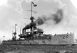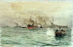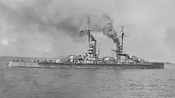 After the start of the war in July 1914, work on the vessels was accelerated so they would be available for operations as soon as possible. König and Grosser Kurfürst were completed in the first weeks of World War I; the latter had completed sea trials in time to take part in the Raid on Yarmouth on 3 November 1914, as part of the High Seas Fleet, which provided distant cover to the battlecruisers of I Scouting Group that carried out the raid. Grosser Kurfürst participated in the raid on Scarborough, Hartlepool, and Whitby on 15–16 December, again providing distant support to the battlecruisers.[40][41] Grosser Kurfürst, assigned to III Battle Squadron, formed the vanguard of the German line of battle. During the operation on the morning of 16 December, the High Seas Fleet, commanded by Admiral Friedrich von Ingenohl, briefly clashed with the destroyer screen of the British 1st Battlecruiser Squadron and the 2nd Battle Squadron, which had been sent to intercept their German counterparts (as the British were able to decipher German codes thanks to a set of code books captured from the cruiser Magdeburg in August). Ingenohl, under orders from the Kaiser not to risk the fleet and fearing he had located the scouts for the entire Grand Fleet, disengaged and returned to port.[42]