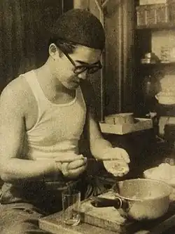 Abe returned to Tokyo briefly in April 1940 to study at Seijo High School, but a lung condition forced his return to Mukden, where he read Jaspers, Heidegger, Dostoyevsky, and Edmund Husserl. Abe began to study medicine at Tokyo Imperial University in 1943, partially out of respect for his father, but also because "[t]hose students who specialized in medicine were exempted from becoming soldiers. My friends who chose the humanities were killed in the war."[8] He returned to Manchuria around the end of World War II.[1] Specifically, Abe left the Tokyo University Medical School in October 1944, returning to his father's clinic in Mukden.[8] That winter, his father died of eruptive typhus. Returning to Tokyo with his father's ashes, Abe reentered the medical school. Abe started writing novellas and short stories during his last year in university. He graduated in 1948 with a medical degree, once joking that he was allowed to graduate only on the condition that he would not practice.[2][8]