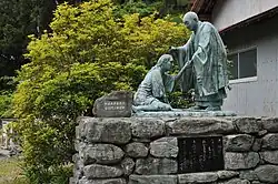 Another legend tells the story of Emon Saburō, the wealthiest man in Shikoku. One day, a mendicant monk came to his house, seeking alms. Emon refused, broke the pilgrim's begging bowl, and chased him away. After this, his eight sons fell ill and died. Emon realized that Kūkai was the affronted pilgrim and set out to seek his forgiveness. Having traveled round the island twenty times clockwise in vain, he undertook the route in reverse. Finally, he collapsed exhausted and on his deathbed. Kūkai appeared to grant absolution. Emon requested that he be reborn into a wealthy family in Matsuyama so that he might restore a neglected temple. Dying, he clasped a stone. Shortly afterwards a baby was born with his hand grasped tightly around a stone inscribed "Emon Saburō is reborn." When the baby grew up, he used his wealth to restore the Ishite-ji (石手寺; "Stone-hand Temple"), in which there is an inscription from 1567 recounting the tale.[22][23]