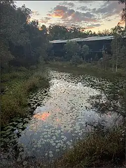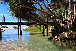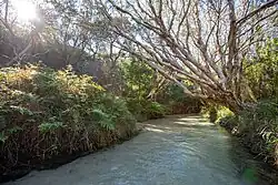 Eli Creek is the largest freshwater creek on the east coast of K'gari with a flow of 80 million litres per day.[112] Eli Creek has its own unique and varied wild life. Coongul Creek, on the west coast, has a flow rate of four to five million litres per hour.[108] Some of the swamps on the island are fens, particularly near Moon Point. That was only discovered in 1996, when a group of experts who had attended a Ramsar conference in Brisbane flew over the island and conducted an aerial survey.[113] From above, they noticed the distinct patterns of potholed peat devoid of trees. That was the first instance of fens being found in Australia and in a sub-tropical region, although more were subsequently discovered on the adjacent Cooloola coast.
