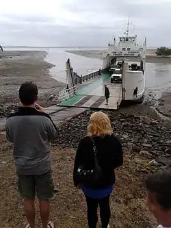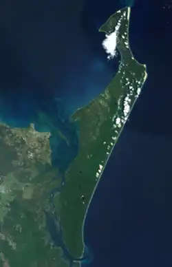 K'gari is separated from the mainland by Great Sandy Strait. The southern tip, near Tin Can Bay, is situated to the north of Inskip Peninsula. The most northern point of the island is Sandy Cape where the Sandy Cape Light was established in 1870 and is still operating.[107] The establishment of the lighthouse was the first permanent European settlement on the island.[24] The nearest large town to the island is Hervey Bay, while Maryborough and Bundaberg are also close by. The bay on the north east coast is called Marloo Bay and on the north west coast is Platypus Bay. The most westerly place on the island is Moon Point.[108]