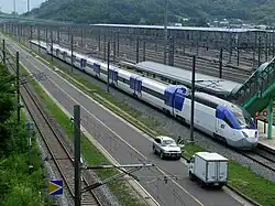 Construction started before the choice of the main technology supplier, thus alignment design was set out to be compatible with all choices.[6] Of the planned 411 km (255 mi) line, 152.73 km (94.90 mi) would be laid on bridges, and another 138.68 km (86.17 mi) in tunnels.[6] However, plans were changed repeatedly,[11] in particular those for city sections, following disputes with local governments,[12] while construction work suffered from early quality problems.[13] Planned operating speed was also reduced from 350 km/h (217 mph) to the 300 km/h (186 mph) maximum of high-speed trains on the market.[5] Three competitors bid for the supply of the core system, which included the rolling stock, catenary and signalling:[14] consortia led by GEC-Alsthom, today Alstom, one of the builders of France's TGV trains; Siemens, one of the builders of Germany's ICE trains; and Mitsubishi Heavy Industries, one of the builders of Japan's Shinkansen trains.[15] In 1994, the alliance of GEC-Alsthom and its Korean subsidiary Eukorail were chosen as winner.[16]