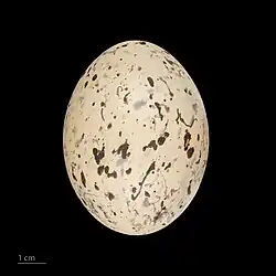 Kagus are monogamous breeders, generally forming long-term pair bonds that are maintained for many years, even possibly life. Kagu can be long lived, with birds in captivity living for over 20 years.[5] A single nesting attempt is made each year, although should the first nesting attempt fail a second attempt is made that year.[12] A simple nest is constructed, which is little more than a heaped pile of leaves, although in some cases the egg may be laid directly on the ground. The nest is not concealed but is usually adjacent to a tree trunk, log or low vegetation. A single grey slightly blotched egg is laid which weighs 60–75 g. Incubation duties are shared by the parents. Each bird will incubate the egg for 24 hours, with the changeover occurring around noon each day. During each incubation stint the parent will remain on the egg the whole time except early in the morning, when the bird will briefly move away to call to its mate and occasionally forage quickly. The incubation period lasts for 33–37 days, which is long for the size of the egg.[5]