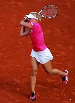 Seeded sixth at the Estoril Open, Kanepi won her third WTA title defeating Carla Suárez Navarro in the final.[18][19] At the Madrid Open, Kanepi was defeated in the first round by Lucie Šafářová. Before the French Open, Kanepi reached the semifinals at the Brussels Open where she lost to top seed and eventual champion, Agnieszka Radwańska.[20] At the French Open, Kanepi entered as the 23rd seed and played a very good tournament given her ranking, defeating Alexandra Panova, Irina-Camelia Begu, ninth seed Caroline Wozniacki, and Arantxa Rus. She was defeated in her quarterfinal match by second seed and eventual champion, Maria Sharapova.[21]