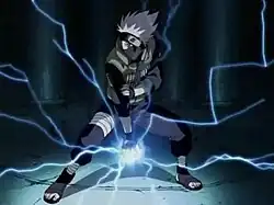 Kakashi Hatake is introduced as the Jonin (elite ninja) leader in charge of Team 7, a new ninja team including Naruto Uzumaki, Sasuke Uchiha and Sakura Haruno. He first appears as a carefree character and tends to lose track of time, being frequently late to his appointments as a result.[19] However, when testing his students, Kakashi reveals himself as a strong opponent to the point of fighting while reading Make Out (イチャイチャ, Icha Icha) series of erotic novels.[20] Kakashi is renowned throughout the Naruto world for the use of his Sharingan, which he received from his teammate Obito Uchiha, and is revered as the ninja who has copied over a thousand jutsus, earning him the moniker "Copy Ninja Kakashi" (コピー忍者のカカシ, Kopī Ninja no Kakashi) and "Kakashi of the Sharingan" (写輪眼のカカシ, Sharingan no Kakashi). The Sharingan grants him the ability to mimic the movements and jutsu of others.[21][22] Although most of Kakashi's abilities were acquired with his Sharingan, he also invented the Chidori (千鳥; lit. "One Thousand Birds") and its Lightning Blade variation, a collection of lightning chakra in one's hand that uses the Sharingan's visual ability to lock onto a target.[23] When first forming Team 7, Kakashi does not take them as his students until instilling in them the concept of teamwork even if they have to break the rules he gave them.[24] Kakashi continues to further this philosophy for the duration of Part I upon Sasuke Uchiha but is unable to get through to him before the latter's defection from Konoha.[25] Kakashi also reluctantly participates in various challenges by his childhood friend Might Guy who considers Kakashi his rival.