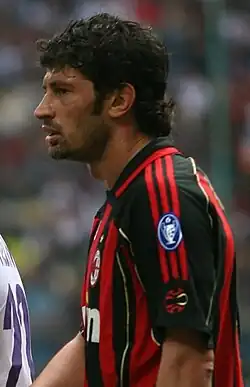 In January 2001, Kaladze became the most expensive Georgian footballer in history when Milan paid €16 million to bring him to Italy.[22] His burning desire to join one of the European top teams coincided with witnessing his teammate's near career-ending injury.[23][12] Upon his arrival, Kaladze became a regular starter almost immediately, and played mostly as a left-sided defensive midfielder in 4–4–2 or 4–2–1–3 formations, particularly under caretaker coach Cesare Maldini.[24][14] On 11 May 2001, Kaladze played from start to the final whistle in the historic 6–0 Derby della Madonnina victory for Milan over Inter, in which he assisted the fifth goal of the game scored by Andriy Shevchenko; Kaladze and Shevchenko, once teammates and regulars in the Dynamo Kyiv starting XI, celebrated the goal together as personally significant and gave each other a hug. However, on 17 June 2001, Kaladze opened the score in the eventual 2–1 away loss against Reggina yet refused to celebrate the goal as most of his thoughts were still with his brother, Levan, who had been kidnapped in Georgia just three weeks prior.[25]