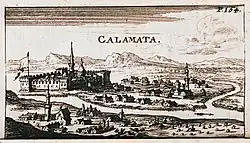 Kalamata was occupied by the Ottomans in 1481. In 1659, during the long war between Ottomans and Venetians over Crete, the Venetian commander Francesco Morosini, captured Kalamata in an effort to divert Ottoman attention from the Siege of Candia, and raise a wider revolt. The Venetian fleet took Kalamata without effort, as the Ottomans abandoned the town. The town and its castle were plundered and destroyed, and all able-bodied men were carried off to serve as rowers in the Venetian galleys.[15][16] Morosini returned in 1685, at the start of the Morean War: on 14 September 1685 the Venetians defeated an Ottoman army before Kalamata, and again plundered and destroyed the town's castle, as it was judged obsolete.[17][18] Kalamata was then ruled by Venice as part of the "Kingdom of the Morea" (Italian: Regno di Morea). During the Venetian occupation the city was developed and thrived economically. However, the Ottomans reoccupied Kalamata in the war of 1715 and controlled it until the Greek War of Independence.