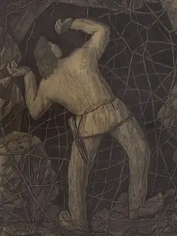 Kalevipoeg travels to Finland in search of his kidnapped mother. During his travel he purchases a sword but kills the blacksmith's eldest son in an argument. The blacksmith places a curse on the sword. On returning to Estonia Kalevipoeg becomes king after defeating his brothers in a stone hurling competition. He constructs towns and forts and tills the land in Estonia. Kalevipoeg then journeys to the ends of the earth to expand his knowledge. He defeats Satan in a trial of strength and rescues three maidens from hell. War breaks out and destruction visits Estonia. Kalevipoeg's faithful comrades are killed, after which he hands the kingship to his brother Olev and withdraws to the forest, depressed. Crossing a river, the sword cursed by the Blacksmith and previously lost in the river attacks and cuts off his legs. Kalevipoeg dies and goes to heaven. Taara (Thor), in consultation with the other gods, reanimates Kalevipoeg, places his legless body on a white steed, and sends him down to the gates of hell where he is ordered to strike the rock with his fist, thus entrapping hell in the rock. So Kalevipoeg remains to guard the gates of hell.[5]