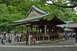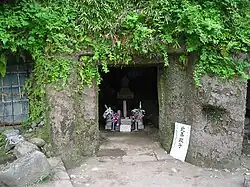 Ankokuron-ji claims to have on its grounds the cave where the master, with the help of a white monkey, hid from his persecutors.[14] (However Hosshō-ji in Zushi's Hisagi district makes the same claim, and with a better historical basis.)[16][17] Within Ankokuron-ji lie also the spot where Nichiren used to meditate while admiring Mount Fuji, the place where his disciple Nichiro was cremated, and the cave where he is supposed to have written his Risshō Ankoku Ron.[14]