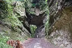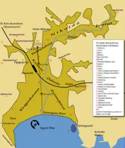 Surrounded to the north, east, and west by hills and to the south by the open water of Sagami Bay, Kamakura is a natural fortress.[37] Before the construction of several tunnels and modern roads that now connect it to Fujisawa, Ofuna, and Zushi, on land it could be entered only through narrow artificial passes, among which the seven most important were called Kamakura's Seven Entrances (鎌倉七口), a name sometimes translated as 'Kamakura's Seven Mouths'. The natural fortification made Kamakura an easily defensible stronghold.[37]