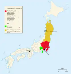 Takauji, founder of the Ashikaga shogunate which, at least nominally, ruled Japan during the 14th, 15th and 16th centuries, at first established his residence at the same site in Kamakura where Yoritomo's Ōkura Bakufu had been, but in 1336 he left Kamakura in charge of his son Yoshiakira and went west in pursuit of Nitta Yoshisada.[24] The Ashikaga then decided to permanently stay in Kyoto, making Kamakura instead the capital of the Kamakura-fu (鎌倉府) (or Kantō-fu (関東府)), a region including the provinces of Sagami, Musashi, Awa, Kazusa, Shimōsa, Hitachi, Kozuke, Shimotsuke, Kai, and Izu, to which were later added Mutsu and Dewa, making it the equivalent to today's Kanto, plus the Shizuoka and Yamanashi Prefectures.[22]