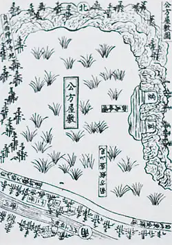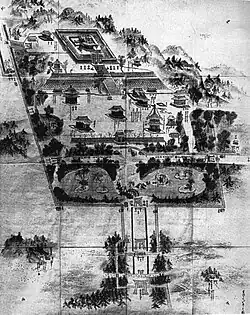 Kamakura's ruler was called kantō kubō, a title equivalent to shōgun assumed by Ashikaga Takauji's son Motouji after his nomination to Kantō kanrei, or deputy shōgun, in 1349.[26] Motouji transferred his original title to the Uesugi family, which had previously held the hereditary title of shitsuji (執事), and would thereafter provide the Kantō kanrei.[26] Motouji had been sent by his father because this last understood the importance of controlling the Kantō region and wanted to have an Ashikaga in power there, but the administration in Kamakura was from the beginning characterized by its rebelliousness, so the shōgun's idea never really worked and actually backfired.[27] The kantō kubō era is essentially a struggle for the shogunate between the Kamakura and the Kyoto branches of the Ashikaga clan, because both believed they had a valid claim to power.[28] In the end, Kamakura had to be retaken by force in 1454.[26] The five kubō recorded by history, all of Motouji's bloodline, were in order Motouji himself, Ujimitsu, Mitsukane, Mochiuji and Shigeuji.[26] The last kubō had to escape to Koga, in today's Ibaraki prefecture, and he and his descendants thereafter became known as the koga kubō. According to the Shinpen Kamakurashi, a guide book published in 1685, more than two centuries later the spot where the kubō's mansion had been was still left empty by local peasants in the hope he may one day return.