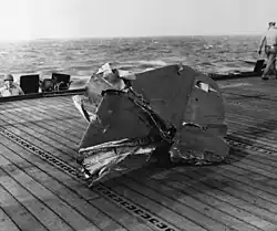 Right horizontal stabilizer from the tail of a "Judy" on the deck of USS Kitkun Bay. The "Judy" made a run on the ship approaching from dead astern; it was met by effective fire and the aircraft passed over the island and exploded. Parts of the aircraft and the pilot were scattered over the flight deck and the forecastle.
