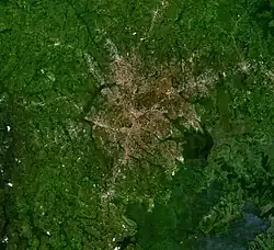 Kampala's metropolitan area consists of the city proper and the neighboring Wakiso District, Mukono District, Mpigi District, Buikwe District and Luweero District. It has a rapidly growing population that is estimated at 6,709,900 people in 2019 by the Uganda Bureau of Statistics[7] in an area of 8,451.9 km2 (3,263.3 square miles). Other estimates estimate put the size of the metropolitan area at around four million people.[8]