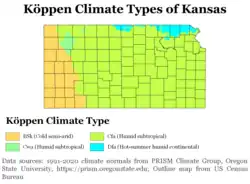 In the Köppen climate classification, Kansas has three climates: humid continental, semi-arid steppe, and humid subtropical. The eastern two-thirds of the state (especially the northeastern portion) has a humid continental climate, with cool to cold winters and hot, often humid summers. Most of the precipitation falls during both the summer and the spring. The USDA hardiness zones for Kansas range from Zone 5b (−15 °F to −10 °F) in the North to Zone 7a (0 °F to 5 °F) in the South.[45]