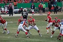 Entering the season, the Chiefs were unsure if injury-prone quarterback Brodie Croyle, who was the incumbent starter, could be their quarterback in the long-term.[87] Croyle was injured in the team's first game of the season and Damon Huard started in Croyle's absence.[88] Tyler Thigpen become the third Chiefs starting quarterback in as many games for a start against the Atlanta Falcons.[89][90] After a poor performance by Thigpen, in which he threw three interceptions against the Falcons defense,[90] Huard was retained as the starting quarterback.[91] The Chiefs struggled off the field as much as on as tight end Tony Gonzalez demanded a trade and running back Larry Johnson was involved in legal trouble.[92][93][94][95]