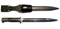 The Karabiner 98k rifle was designed to be used with an S84/98 III bayonet.[13] The S84/98 III had a blade length of 252 mm (9.9 in) and an overall length of 385 mm (15.2 in) and was accompanied by a bayonet frog.[14] The Seitengewehr 42 or SG 42 was a shorter multi tool combat knife that could also be mounted as a bayonet on the Karabiner 98k rifle. The SG 42 was issued in small numbers.