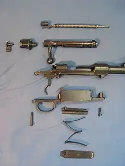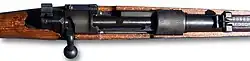 The Karabiner 98k is a controlled-feed bolt-action rifle based on the Mauser M98 system. Its internal magazine can be loaded with five 7.92×57mm Mauser cartridges from a stripper clip or one-by-one.[3] After loading, the empty clip is ejected when the bolt is closed. The straight bolt handle found on the Gewehr 98 bolt was replaced by a turned-down bolt handle on the Karabiner 98k. This change made it easier to rapidly operate the bolt, reduced the amount the handle projected beyond the receiver, and enabled mounting of aiming optics directly above the receiver. Each rifle was furnished with a short length of cleaning rod, fitted through the bayonet stud. The joined rods from 3 rifles provided one full-length cleaning rod.