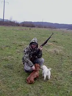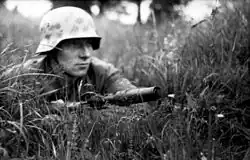 Despite the experiences of World War I, prior to the outbreak of World War II the German military command believed sniper rifles with telescopic sights were not necessary due to military technology advances in connection with new resulting tactics. Partly for that reason, the Karabiner 98k was not designed for use with aiming optics and the German military did not standardize a particular telescopic sight or mounting system and fielded many variants of sniper rifles.[20] Already in the Poland campaign, and especially in the Russian campaign, it became apparent that specialist snipers were urgently needed as substantial losses were suffered caused by enemy snipers. For snipers, Karabiner 98k rifles selected for being exceptionally accurate during factory tests were fitted with a telescopic sight and issued as sniper rifles. The sniper rifles with Zeiss Zielvier 4× (ZF39) telescopic sights were expected to be capable of head or chest shots up to 400 m (437 yd) and to hit a standing man at 600 m (656 yd) when used by a skilled sniper. Regarding effective support/harassment fire ranges of up to 1,000 m (1,094 yd) were achievable. The German Zeiss Zielvier 4× (ZF39) telescopic sight had bullet drop compensation in 50 m (55 yd) increments for ranges from 100 to 800 m (109 to 875 yd) or in some variations from 100 to 1,000 m (109 to 1,094 yd). It was not windage adjustable. There were also Zeiss Zielsechs 6× and Zielacht 8× telescopic sights and sights by various other manufacturers like the Ajack 4× and 6×, Hensoldt Dialytan 4×, Kahles Heliavier 4× and Opticotechna Dialytan 4× with similar features employed on Karabiner 98k sniper rifles.[21] Several different mountings produced by various manufacturers were used.[22] Attaching telescopic sights to a Karabiner 98k required machining by a skilled armourer. A telescopic sight mounted low above the center axis of the receiver will not leave enough space between the rifle and the telescopic sight body for unimpaired operation of the bolt handle or the three-position safety catch lever. This ergonomic problem was solved by mounting the telescopic sight relatively high above the receiver and sometimes modifying or replacing the safety operating lever or using an offset mounting to position the telescopic sight axis to the left side in relation to the receiver center axis.[23] A common minor modification was replacing the stock buttplate with a waffled anti-slip "sniper" buttplate. Approximately 132,000 Karabiner 98k sniper rifles were produced by Germany.[24]