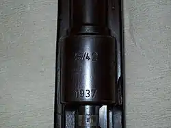 The G40k with a total length of 1,000 mm (39.37 in) and a barrel length of 490 mm (19.29 in) and 3.2 kg (7.1 lb) weight was a shortened experimental version of the Karabiner 98k.[8][24] The rear tangent sight of the G40k was graduated for s.S. Patrone cartridges from 100 m to 1000 m in 100 m increments. A batch of 82 G40k rifles was produced in 1941 at Mauser Oberndorf.[25]