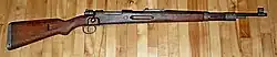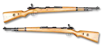 The Karabiner 98 kurz (German: [kaʁaˈbiːnɐ ˌʔaxtʔʊntˈnɔʏntsɪç ˈkʊɐ̯ts]; 'carbine 98 short'), often abbreviated Karabiner 98k, Kar98k or K98k and also sometimes incorrectly referred to as a K98 (K98 is a Polish copy of the Kar98a), is a bolt-action rifle chambered for the 7.92×57mm Mauser cartridge. It was adopted on 21 June 1935 as the standard service rifle by the German Wehrmacht.[1] It was one of the final developments in the long line of Mauser military rifles.