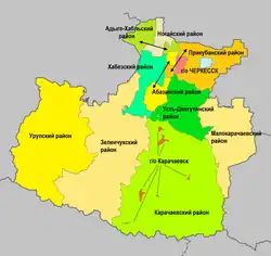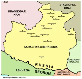 1. ^ Russian: Карачаево-Черкесская Республика, romanized: Karachayevo-Cherkesskaya Respublika; Karachay-Balkar: Къарачай-Черкес Республика, romanized: Qaraçay-Çerkes Respublika; Kabardian: Къэрэшей-Шэрджэс Республика, romanized: Ķêrêšei-Šêrdžês Respublikê; Nogai: Карашай-Шеркеш Республика, romanized: Karaşay-Şerkeş Respublika; Abaza: Къарча-Черкес Республика, romanized: Qarça-Çerkes Respublika