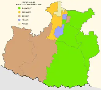 According to the 2021 Census, Karachays make up 44.4% of the republic's population, followed by Russians (27.5%), and Cherkess and Abazins together make up 20.8%.[26]