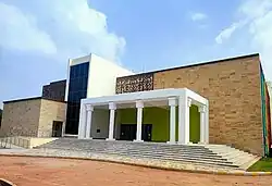 Karaikudi and surrounding areas are popular for their unique Chettinad architecture based buildings and palatial mansions. Kannadasan Manimandapam, Kamban Manimandapam and Thousand windows house are major visitor attractions in Karaikudi.[26] A temple for Tamil Thai (Mother Tamil) was established in 1993.[27] Siraavayal manjuvirattu, a type of jallikattu bull taming festival is held during the annual Pongal festivities.[28] Prominent temples include Sivan temple, Koppudaiya Amman temple, Ariyakudi Thiruvenkatamudayan temple,[29] Pillayarpatti Karpagavinayagar temple, Kundrakudi Shanmughanathar temple, Mathur Ainootreeswarar temple[30] Kandanur Kandaneswarar Sivan temple, Koviloor Kotravaaleeswarar Sivan temple, and Vairavanpatti Valarolinathar-Vadivudai Ambal temple.