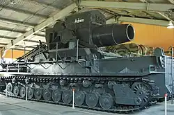 Karl-Gerät (040/041) (lit.'Karl-device' in German), also known as Mörser Karl, was a World War II German self-propelled siege mortar (Mörser) designed and built by Rheinmetall. Its heaviest munition was a 60 cm (24 in) diameter, 2,170 kg (4,780 lb) shell; the range for its lightest shell of 1,250 kg (2,760 lb) was just over 10 km (6 mi). Each gun had to be accompanied by a crane, a two-piece heavy transport set of railcars, and several modified tanks to carry shells.