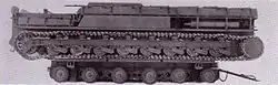 The weapon was moved long distances via rail on a variant of a Schnabel car; the whole chassis was hung between two huge pedestal-mounted swiveling arms fixed to five-axle bogies.[7] When it reached its destination, the weapon was detached from railcars' supporting arms and driven to its intended firing location. The chassis of the ordnance was then lowered to the ground by "raising" the continuous track units' roadwheels by rotating their torsion-bar-sprung suspension arms to drop the chassis close to the ground to distribute the recoil forces more evenly in preparation for firing - the roadwheels for each trackset were also similarly "raised" to allow the tracks to clear the rails while being transported by rail, between the pair of Schnabel railcars. The Karl-Gerät proved to have no problems moving over normal soil, but under no circumstances was it allowed to make turns on soft soil lest it throw a track. The chassis had to be backed into position to fire, which expedited movement to a new position, but the land to be used for the ordnance's firing position had to be precisely leveled and the approach route prepared ahead of time to fill in soft spots and any ditches, etc.[8] The mortar could only be loaded at zero elevation, so it had to be re-aimed between shots.[7]