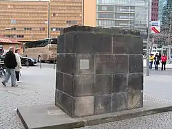 At the site of the 1916 antiwar demonstration, Friedrich Ebert Jr., Lord Mayor of Greater Berlin (East) and member of the Politburo of the Socialist Unity Party of Germany (East German Communist Party), unveiled the cornerstone of a monument to Karl Liebknecht on 13 August 1951, the 80th anniversary of his birth. The tribute took place within the framework of the Third World-Festival of Youth and Students and was part of a campaign against the rearmament of the Federal Republic of Germany (West Germany). But the memorial on Potsdamer Platz was not completed before the erection of the Berlin Wall.