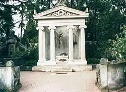 May died in his own Villa Shatterhand on 30 March 1912.[8] According to the register of deaths, the cause was cardiac arrest, acute bronchitis and asthma, but according to Ralf Harder from the Karl-May-Stiftung, May's death certificate does not include the cause of death.[9] Scientists examining the remains of May in 2014 found excessive quantities of lead and other heavy metals, and concluded that his death was probably due to a long-time exposure to lead in water as well as tobacco.[10] May was buried in Radebeul East. His tomb was inspired by the Temple of Athena Nike.[9]