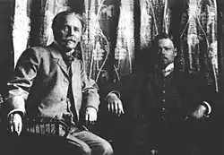 In 1878, May became a freelance writer. Once again, May was insolvent.[4] In 1882, May returned to the employ of Münchmeyer and began the first of five large colportage novels. One of these was Das Waldröschen (1882–1884). From 1879, May was also published in Deutscher Hausschatz ("German House Treasure"), a Catholic weekly journal from the press of Friedrich Pustet in Regensburg. In 1880, May began the Orient Cycle, which ran, with interruption, until 1888. May was also published in the teenage boys' journal Der Gute Kamerad ("The Good Comrade") of Wilhelm Spemann, Stuttgart. In 1887, it published Der Sohn des Bärenjägers ("Son of the Bear Hunter"). In 1891 Der Schatz im Silbersee ("The Treasure of Silver Lake") was published. May published in other journals using pseudonyms. In all, he published over one hundred articles. In October 1888, May moved to Kötzschenbroda (a part of Radebeul) and in 1891 to Villa Agnes in Oberlößnitz. In 1891, Friedrich Ernst Fehsenfeld offered to print the Deutscher Hausschatz "Son of the Bear Hunter" stories as books. In 1892, the publication of Carl May's Gesammelte Reiseromane (Collected Travel Accounts or Karl May's Gesammelte Reiseerzählungen) brought financial security and recognition. May became deeply absorbed in the stories he wrote and the lives of his characters. Readers wrote to May, addressing him as the protagonists of his books. May conducted talking tours in Germany and Austria and allowed autographed cards to be printed and photos in costume to be taken. In December 1895, May moved to the Villa Shatterhand in Alt-Radebeul, which he purchased from the Ziller brothers.[5]
