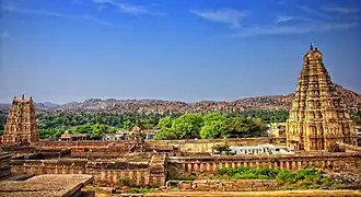 At the turn of the first millennium, the Hoysalas gained power in the region. Literature flourished during this time, which led to the emergence of distinctive Kannada literary metres, and the construction of temples and sculptures adhering to the Vesara style of architecture.[40][41][42][43] The expansion of the Hoysala Empire brought minor parts of modern Andhra Pradesh and Tamil Nadu under its rule. In the early 14th century, Harihara and Bukka Raya established the Vijayanagara empire with its capital, Hosapattana (later named Vijayanagara), on the banks of the Tungabhadra River in the modern Bellary district. Under the rule of Krishnadevaraya, a distinct form of literature and architecture evolved.[44][45] The empire rose as a bulwark against Muslim advances into South India, which it completely controlled for over two centuries.[46][47] In 1537, Kempe Gowda I, a chieftain of the Vijayanagara Empire, widely held as the founder of modern Bengaluru, built a fort and established the area around it as Bengaluru Pete.[48]