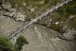 The Indus River system forms the drainage basin of the Kashmir region. The river enters the region in Ladakh at its southeastern corner from the Tibetan Plateau, and flows northwest to run a course through the entire Ladakh and Gilgit-Baltistan. Almost all the rivers originating in this region are part of the Indus River system.[50] After reaching the end of the Great Himalayan range, the Indus turns a corner and flows southwest into the Punjab plains. The Jhelum and Chenab rivers also follow a course roughly parallel to this, and join the Indus River in southern Punjab plains in Pakistan.