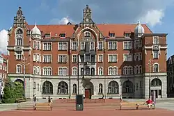 In 1882, the Upper Silesian Coal and Steelworks Company (Oberschlesischer Berg- und Hüttenmännischer Verein) moved its headquarters to Katowice, followed by creation of the Upper Silesian Coal Convention (Oberschlesische Kohlen-Konvention) in 1898. Civic development followed industrial development: in 1851, the first post office opens in Katowice, and in 1893 the current regional post office headquarters have been opened; in 1871 the first middle school was opened (later expanded to high school); in 1889, Katowice got a district court; in 1895, the city bath opened and regional headquarters of the Prussian state railways has been established in the city; in 1907, the city theater (currently the Silesian Theatre) opened.