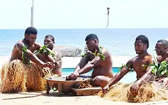 Fijian kava ceremony being performed for tourists (2015). Traditionally, kava grog is drunk from the shorn half-shell of a coconut, called a bilo.[46]
