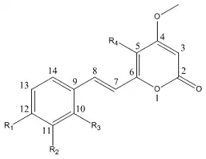 The general structure of the kavalactones, without the R1-R2 -O-CH2-O- bridge and with all possible C=C double bonds shown