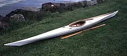 Original Aleutian kayaks (Inuktitut: qajaq (ᖃᔭᖅ Inuktitut pronunciation: [qaˈjaq]), Yup'ik: qayaq (from qai- "surface; top"),[3] Aleut: Iqyax) were originally developed by the Inuit, Yup'ik, and Aleut.[4] They used the boats to hunt on inland lakes, rivers and coastal waters of the Arctic Ocean, North Atlantic, Bering Sea and North Pacific oceans. These first kayaks were constructed from stitched seal or other animal skins stretched over a wood or whalebone-skeleton frame. (Western Alaskan Natives used wood whereas the eastern Inuit used whalebone due to the treeless landscape.) Kayaks are believed to be at least 4,000 years old.[5] The oldest kayaks remaining are exhibited in the North America department of the State Museum of Ethnology in Munich, with the oldest dating from 1577.[6]