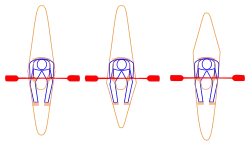 Primary (sometimes called initial) stability describes how much a boat tips, or rocks back and forth when displaced from level by paddler weight shifts. Secondary stability describes how stable a kayak feels when put on edge or when waves are passing under the hull perpendicular to the length of the boat. For kayak rolling, tertiary stability, or the stability of an upside-down kayak, is also important (lower tertiary stability makes rolling up easier).[28]