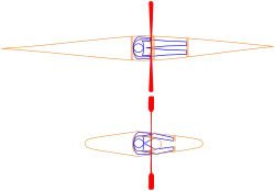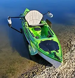 Newcomers will often want a craft with high primary stability (see above). The southern method is a wider kayak. The West Greenland method is a removable pair of outriggers, lashed across the stern deck.[25][32] Such an outrigger pair is often homemade of a small plank and found floats such as empty bottles or plastic ducks.[33] Outriggers are also made commercially, especially for fishing kayaks and sailing. If the floats are set so that they are both in the water, they give primary stability, but produce more drag. If they are set so that they are both out of the water when the kayak is balanced, they give secondary stability.[34][35]