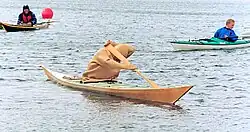 Subarctic builders designed and built their boats based on their own experience and that of the generations before them passed on through oral tradition. The word "kayak" means "man's boat" or "hunter's boat", and subarctic kayaks were a personal craft, each built by the man who used it and closely fitting his size for maximum maneuverability. For this reason, kayaks were often designed ergonomically using one's own body proportions as units of measure.[7] The paddler wore a tuilik, a garment that was stretched over the rim of the kayak coaming and sealed with drawstrings at the coaming, wrists, and hood edges. This enabled the "eskimo roll" and rescue to become the preferred methods of recovery after capsizing, especially as few Inuit could swim; their waters are too cold for a swimmer to survive for long.[8]