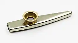 The kazoo is a musical instrument that adds a buzzing timbral quality to a player's voice when the player vocalizes into it. It is a type of mirliton (itself a membranophone), one of a class of instruments that modify the player's voice by way of a vibrating membrane of goldbeater's skin or material with similar characteristics. There is a smaller version of the kazoo, known as a humazoo.[1]